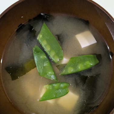 絹さやがシャキッと、緑も綺麗なお味噌汁でした。