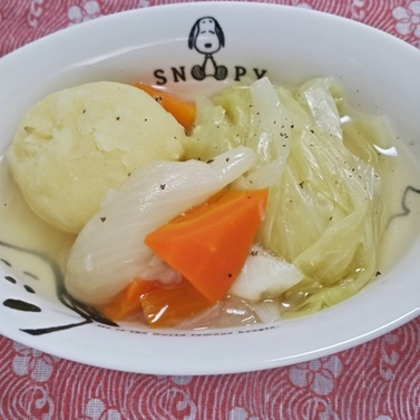 玉ねぎ にんじん キャベツ ざっくりゴロッと切った野菜たちをコンソメと塩・胡椒で味を整え、別に火を通したじゃがいもを加えて完成させました。野菜の甘味を活かすよう、弱めの調味がお気に入りです。 【きゅうしょくじいじ】様 |