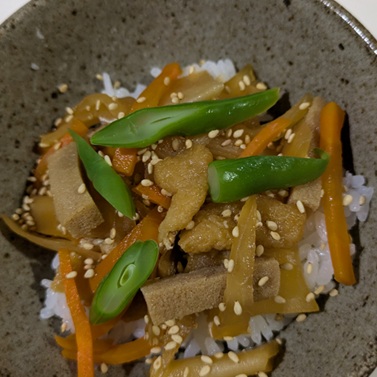 しっかり味を吸ったしらたきや豚肉がご飯とよく合う美味しい丼ものでした。たくさん作ったので明日も食べられます。