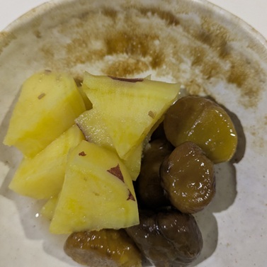 さつまいもがどうも食指が動かなかったのですが、スーパーで見かけるようになり作りました。自分で加減できるので甘さも控えめにして、食べやすい煮物でした。