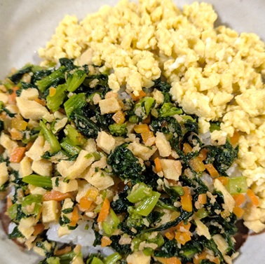 なばなをスーパーで見かけるようになり、作ってみました。なばなの独特の風味もあり、高野豆腐や鮭フレークなんかも一緒でとても食べやすくおいしかったです。