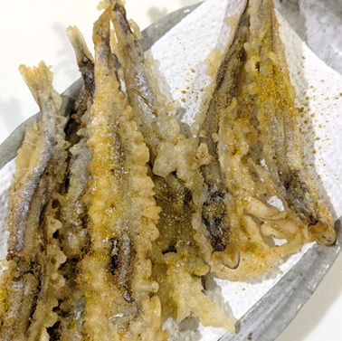 ワカサギやきびなごが見つけられず、シシャモを代わりに使いました。カリッと揚がって、カレーの香りと良く合いました。ちょっとマヨネーズ付けてもおいしかったです。