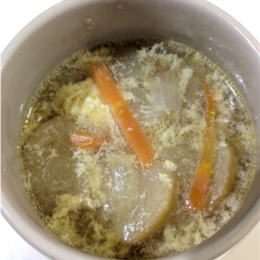 ニンニクが軽く香るスープに卵で優しい雰囲気になっておいしいスープになりました。